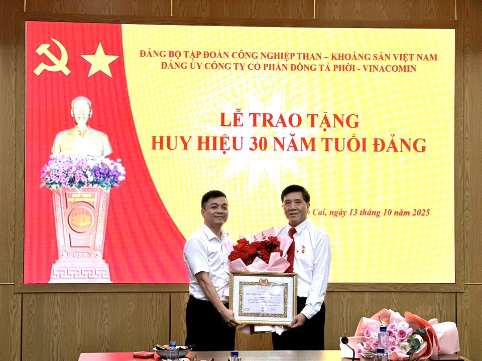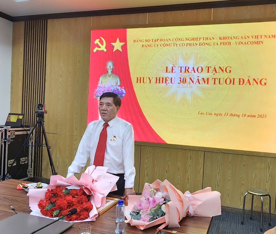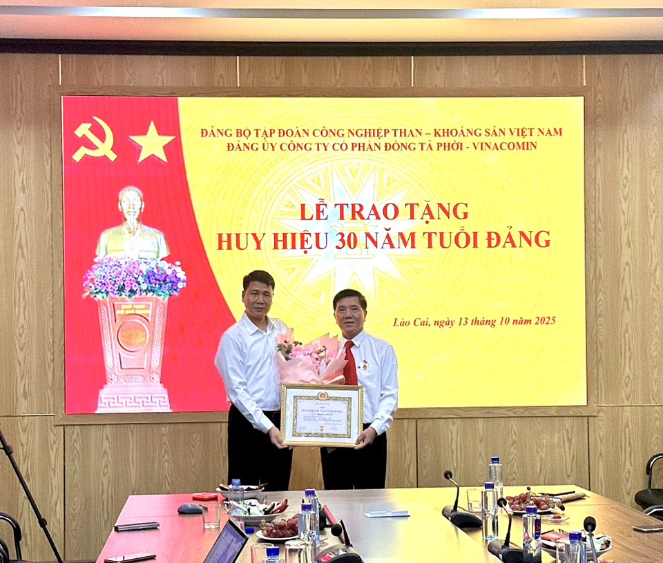 ✅ Chiều ngày 13/10/2025, Đảng ủy Công ty cổ phần đồng Tả Phời - Vinacomin long trọng tổ chức Lễ trao tặng Huy hiệu 30 năm tuổi Đảng cho đồng chí Nguyễn Anh Tú - Phó Giám đốc Công ty, Đảng viên Chi bộ Cơ điện - Vận tải. Đây là sự kiện có ý nghĩa sâu sắc, là sự ghi nhận, tôn vinh những đóng góp, cống hiến quý báu của đồng chí Nguyễn Anh Tú cho sự nghiệp cách mạng vẻ vang của Đảng, góp phần xây dựng Đảng bộ Công ty vững mạnh.